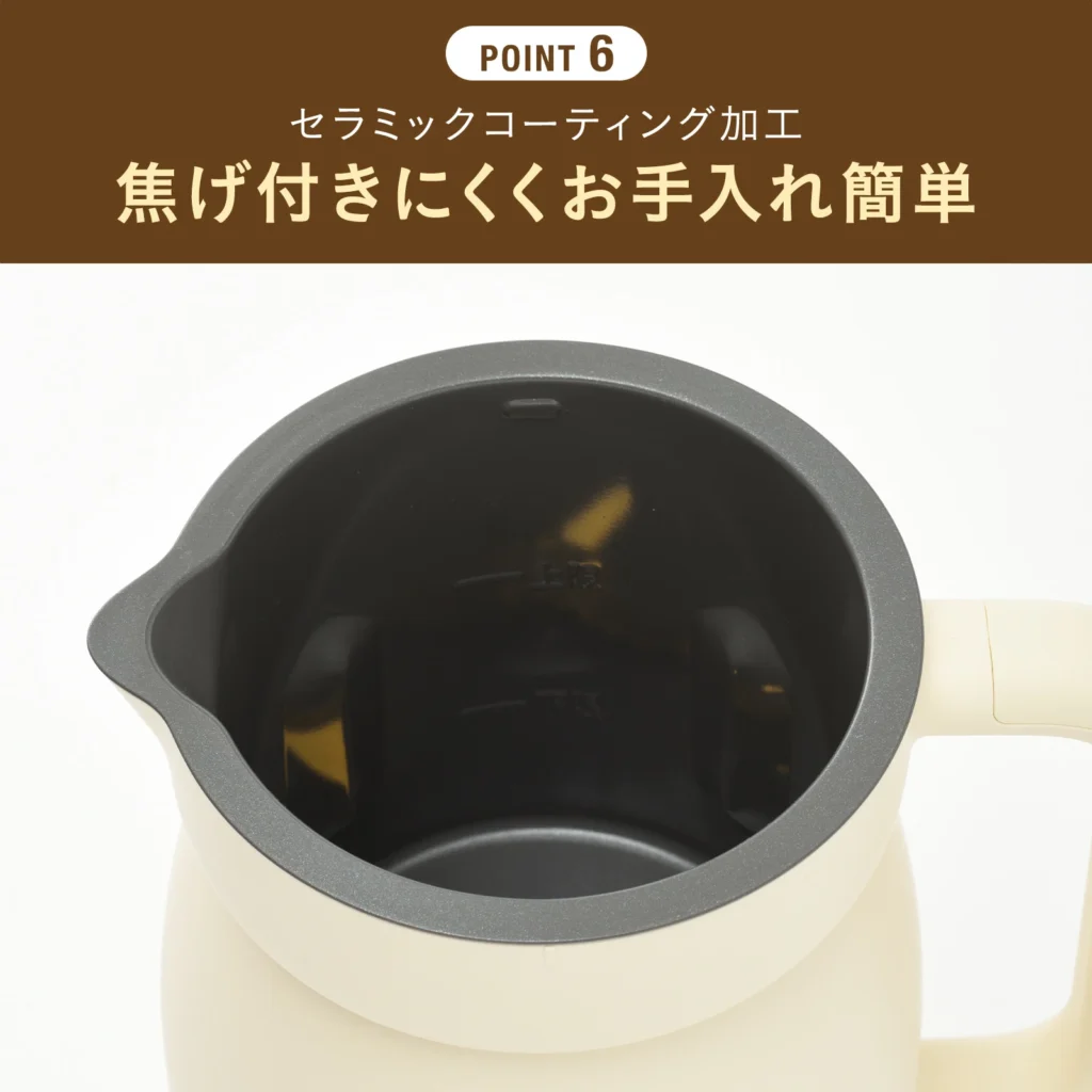 セラミックコーティングのポットで汚れがつきにくく、洗浄モードで内部の清潔を保てます。ただし食品を扱う家電全般に言えることですが、使用後は速やかにお手入れし、完全に乾燥させてから保管することが重要です。離乳食への使用を検討している方は、取扱説明書の食品衛生に関する注意事項もあわせてご確認ください。